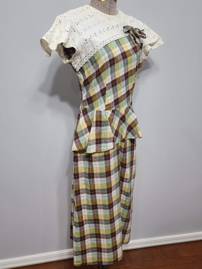 Brown Yellow Green Plaid Dress B 36 W 28 H 37
